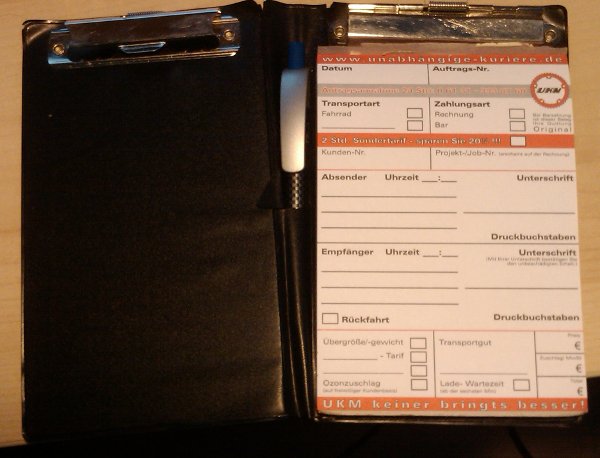 ich kann meine touren abends als pdf abrufen. mehr als was wir auf dem server pro kopf speichern, wüßte ich mir auch gar nicht zu jeder fahrt zu notieren. wenn die übliche "wannwiewo-kunde ist am rohr"-frage kommt, meistens am funk, selten per telefon, dann grübelt man schnell, erinnert sich -wenn nicht die frage grad ein blackout auslöst - mir schon passiert- und erklärt halt "junge dame, ende zwanzig, brille, kopf kleiner als ich, hat gelispelt, die hat das angenommen, weil der tresen grad nicht besetzt war.." dann ist in den meisten fällen alles geklärt und der kunde weiß, daß es nicht der kurier sondern sein eigener betrieb bescheuert ist ;)