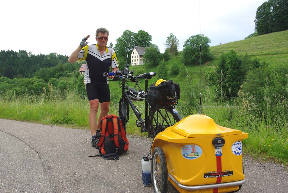 Das Foto zeígt mich an der Landstraße von Glottertal hoch nach St. Peter im Südschwarzwald. Da hatte ich "Urlaub". 40 kg in der gelben Kiste.