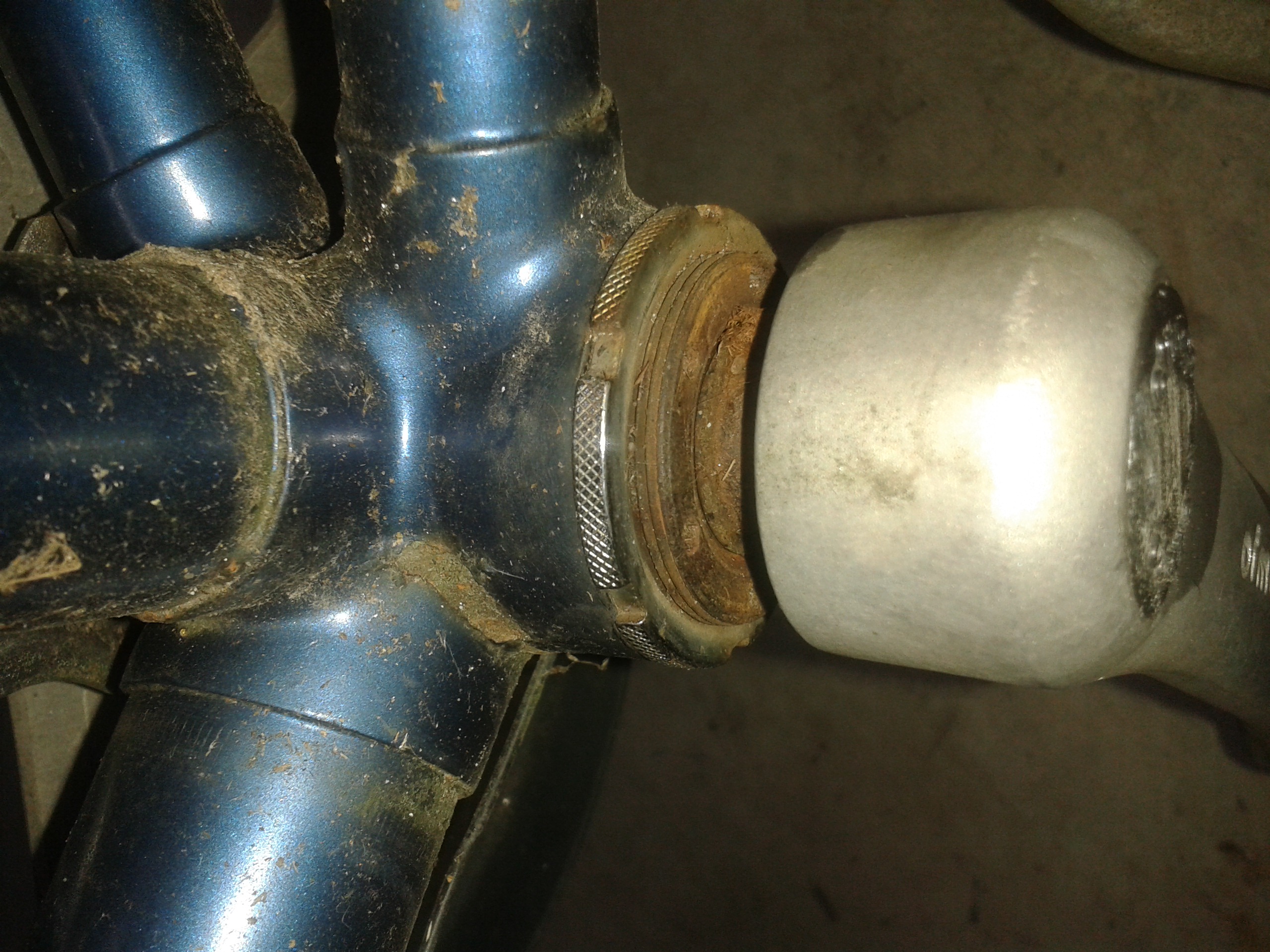 Der Ring außen ist ein Konterring. Wenn das so hart festgegammelt ist wie es scheint, bekommste das mit einem Hakenschlüssel vermutlich nicht auf. Ich musste eine Rohrzange bemühen.