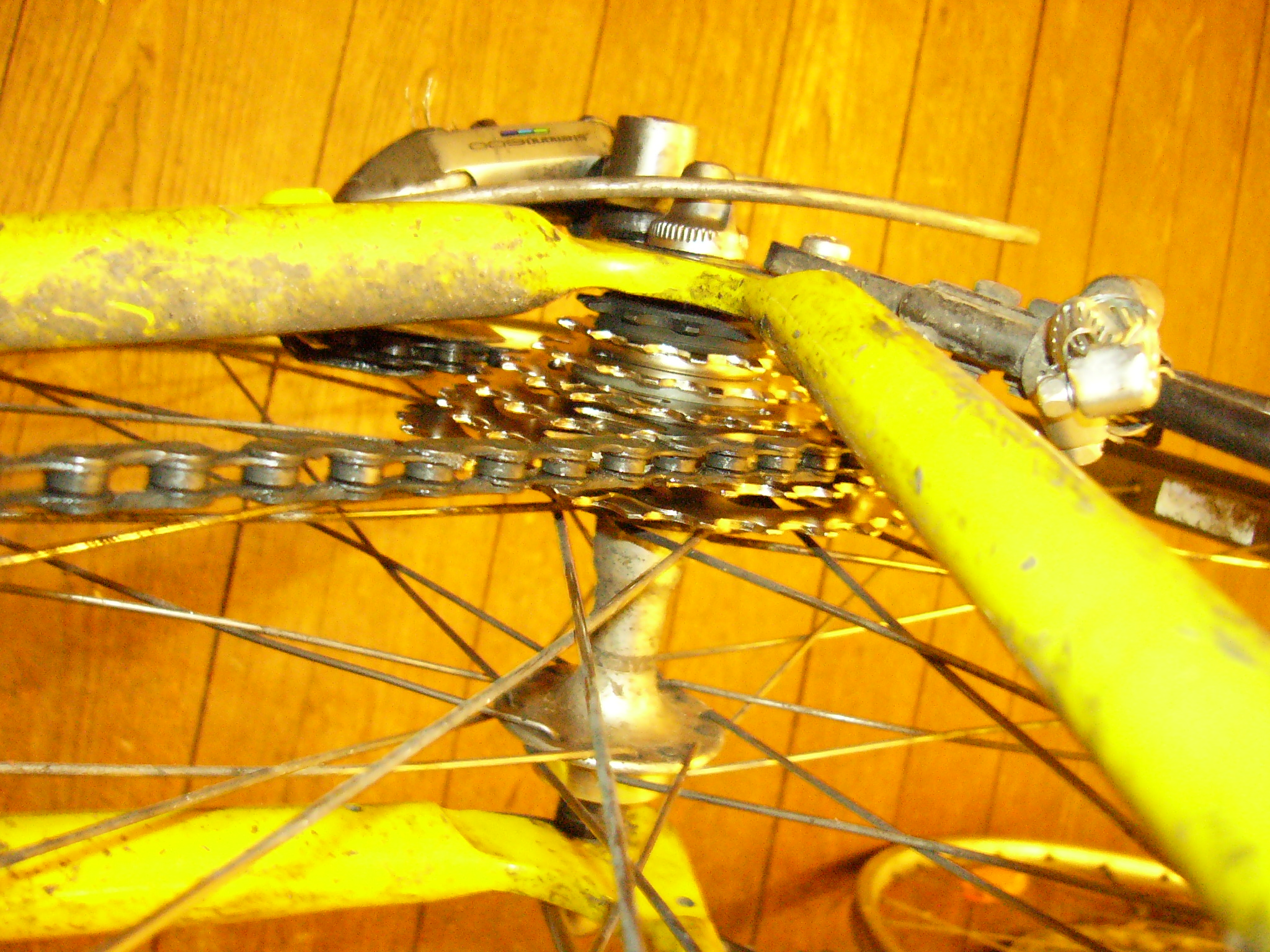 allerdings benutze ich die schaltung hinten eh nicht, weil ich aus kostengründen eine 6er-kassette statt 8er gekauft habe (weil ich dem typen gesagt hab, die gangschaltung geht eh nicht. jetzt ginge sie, aber...äh, naja. ein teufelskreis.). zwei gänge sind ja auch MEHR als ausreichend!
