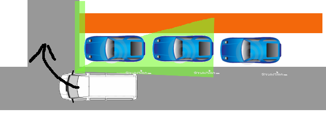 3. Und dann lande ich da. Ich bin ein Stück abgebogen um mich vorzutasten und bin deshalb im total Blindfeld. Der tote Winek Spiegel leuchtet zwar schön den Bereich direkt neben meinem auto aus (das hab ich nicht so deutlich gemacht, aber das ist es was er macht). Aber alles zwischen rechts aus dem Fenster schauen und dem Anfang des Spiegelwinkels ist einfach überhaupt nicht zu sehen. Durch mein schräges abbiegen hab ich mich in eine Situation gebracht, in de ich absolut blind bin gegenüber dem was auf dem Fuß und Radweg passiert.