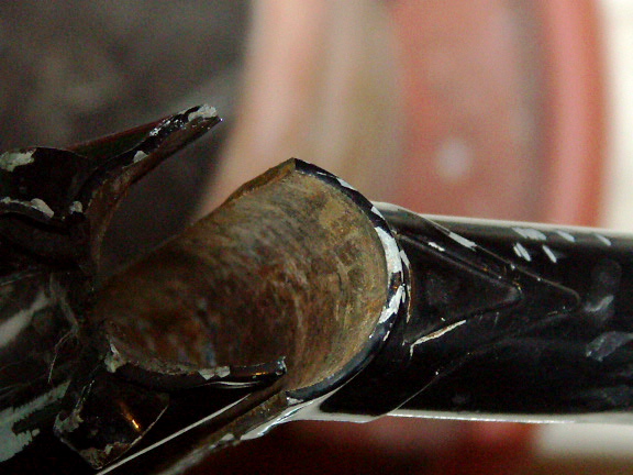 Schöner leichter Columbus SL Satz ( an die 0,5mm dünn an den dünnsten Stellen in der Mitte und nur doppelt endverstärkt, das ist warum das Ding gerissen ist) mit passenden Muffen und erstklassigen Zeus Ausfallenden... Ein Rahmen für Madison und Scratch Fahrer...
